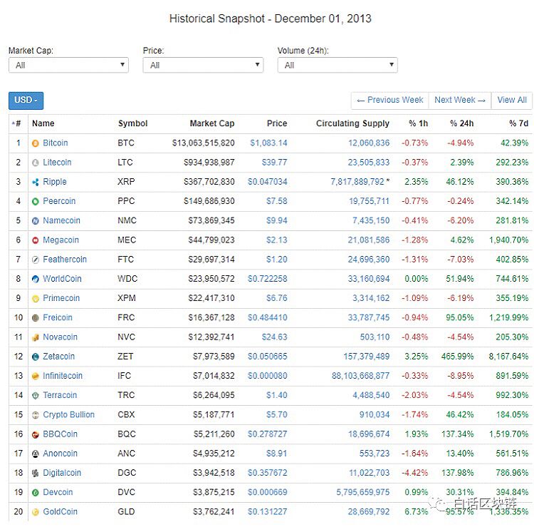 再看看币圈2013年12月份的前20名排行,是不是除了当时排在前三的比特,莱特,Ripple,剩下的你都不认识,或者已经消失不见了?