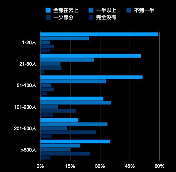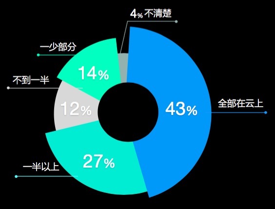 报告显示,在中国,目前大部分企业都能接受使用云服务。已上云的企业中,43%企业将全部业务放在云上,将超半数业务放在云端的企业有70%。这背后是各大企业在加速数字化转型,政策、资本和市场教育等因素也推动了云计算应用普及。