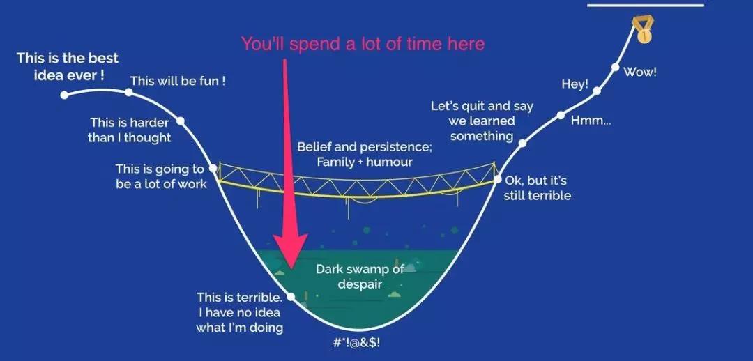 你会在上图绿色的「绝望的黑暗泥沼」耗费很多时间,而真正能帮助你的是信念和坚持,以及家人和幽默感。
