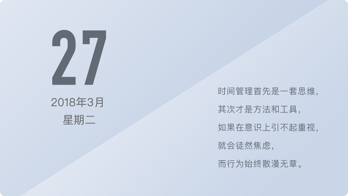 大部分觉得自己时间管理有问题的人,问题就在于其实并不是多注重时间管理。重视,就是从战略到战术,全方位地紧绷起来,而不是买椟还珠。重视,就是发自内心地愿意去解决问题,而不只是把问题挂在嘴边。