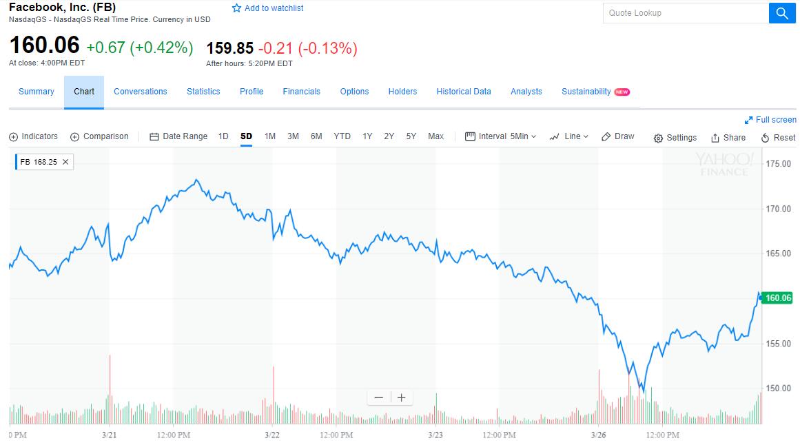 FTC声明发布后,本周一Facebook股价一度接近跌破150美元,创八个月新低,日内跌幅超过5%,和当天大盘走高形成鲜明反差。Facebook周一盘中跌幅曾达到6.5%,午盘逐步抹平跌幅转涨,最终收涨0.42%,但盘后下挫,截至更新,盘后在收盘基础上跌逾0.1%。