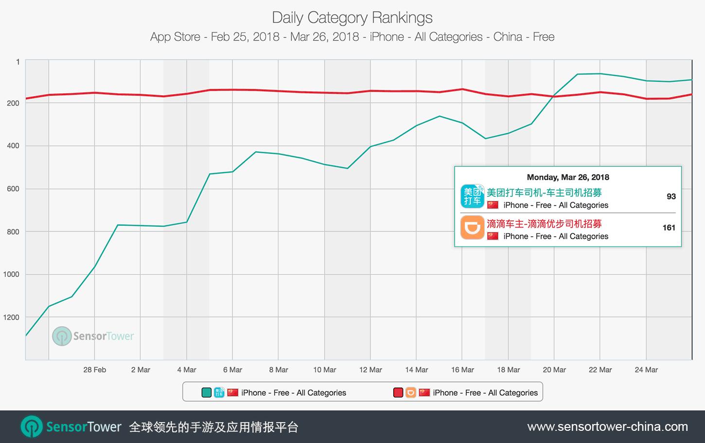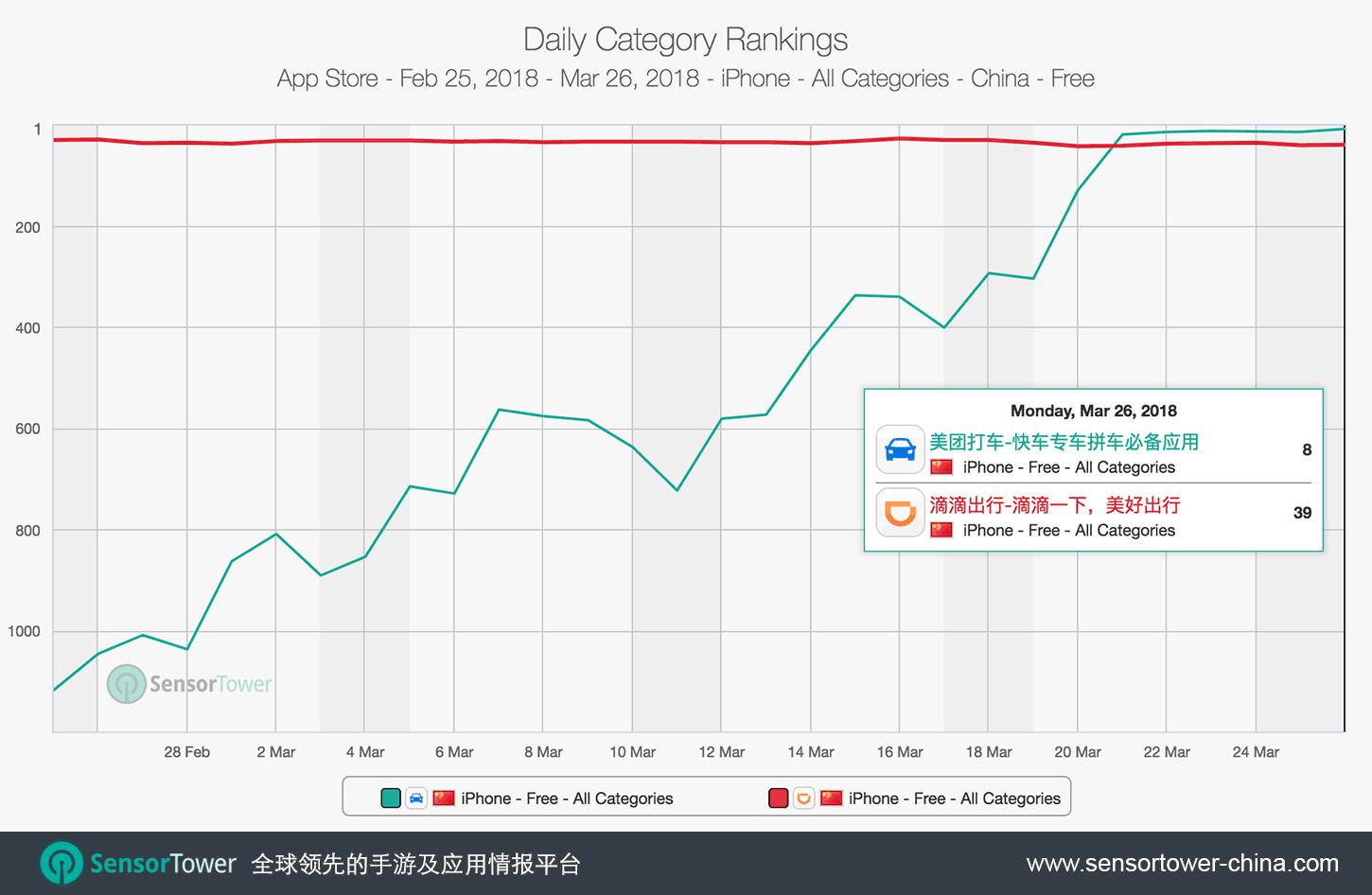 美团打车乘客及司机App登陆上海近一周,iPhone版单日下载量连续六天超越滴滴