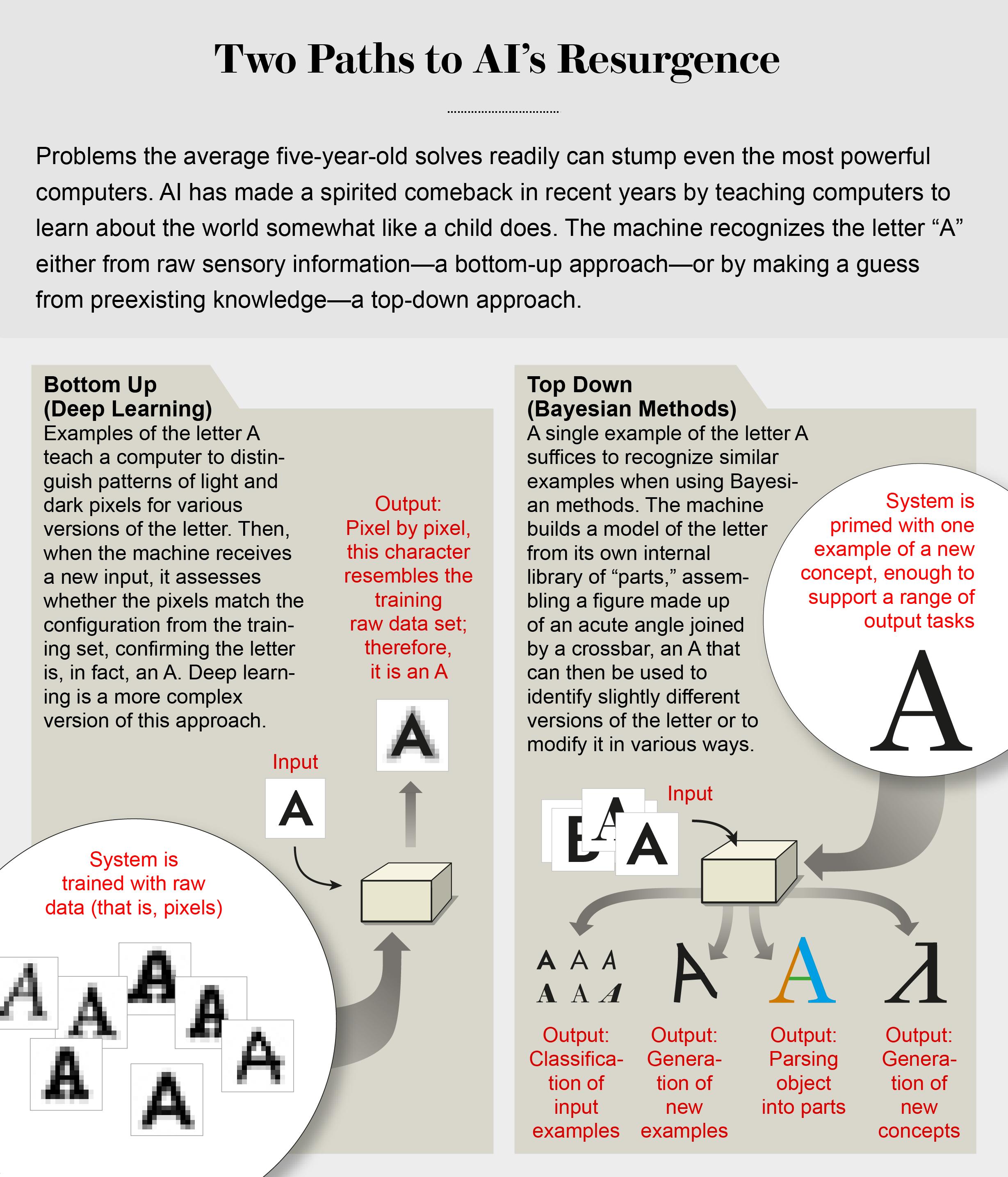 另外一种近些年改变了AI的深度学习方式则是自顶向下的模式。它假设我们可以从具体的数据中得到抽象的解释,因为我们已经知道了很多知识,并且大脑已经可以理解各种基本的抽象概念了。就像科学家,我们可以使用这些概念来形成关于世界的假设,并且预测假设正确的情况下会呈现出哪种情况,这是和自底向上的AI模式相反的方式。