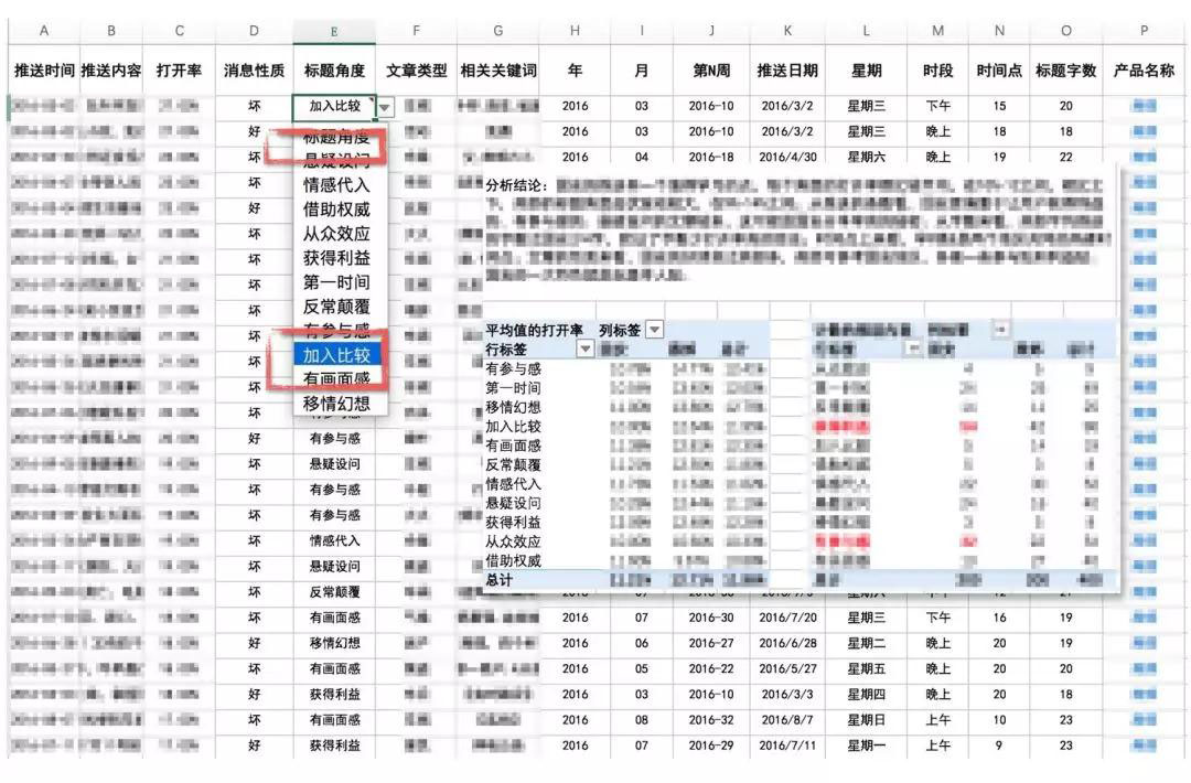 上图是在接触某APP工作时,特意筛选出历史推送效果最好的400条新闻。花了一周时间,逐条揣摩、打标签、划角度、切词,然后各种维度透视分析,试图总结出一套标准化文案推送系统。