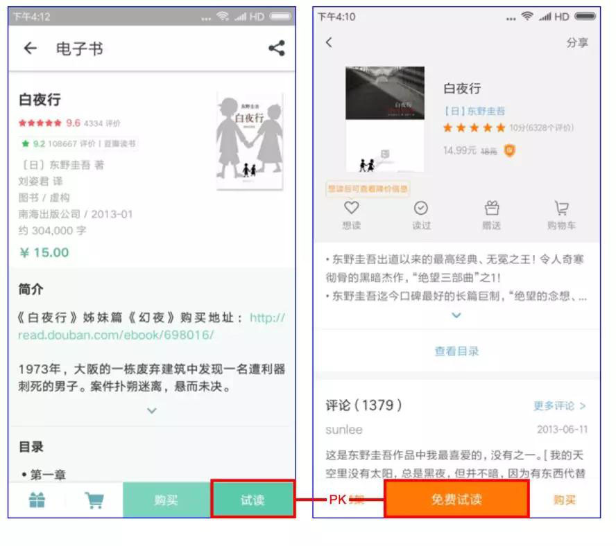 左侧是豆瓣的商品详情页,右侧是多看的商品详情页。人人都知道试读就是免费的,多看偏偏犯语法错误,但从业务目标角度合情合理。试读是需求,免费是欲望,欲望+需求,成就了一条召唤力更强的文案。而豆瓣可能是因为主打文艺范,从个性角度考虑,免费二字有铜臭味。或者真像业界所说: