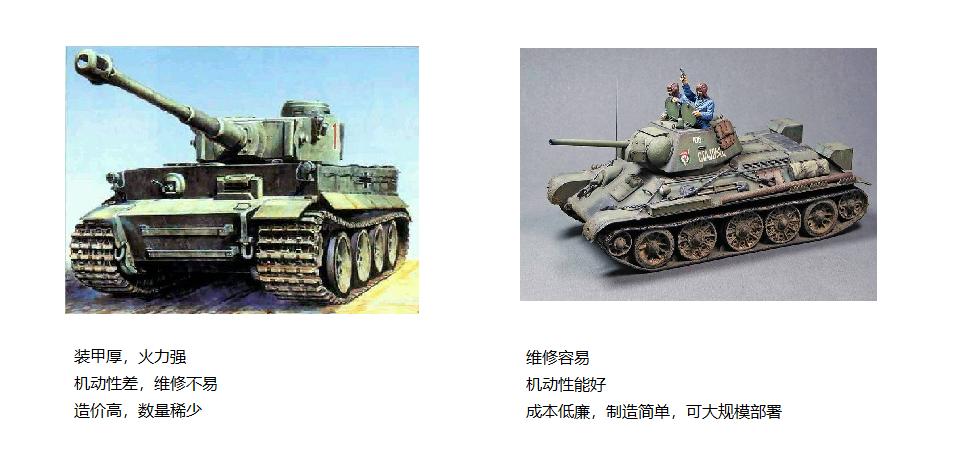 以二战中的德国虎式坦克为例。虎式坦克是坦克里的精品,装甲很酷,火力很强,但是造价太贵了,数量有限。反过来,T34坦克因为比较便宜,可大批量生产,单挑是没戏的,但是群狼蜂拥上去,虎式终于不敌。尽管在付出了巨大的牺牲和损失,但苏军正是依靠数量碾压的优势淹没了高质量的德军装甲部队。