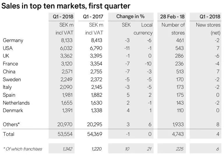 在H&M集团表现最好的十个地区中,H&M 集团最大的两个市场即德国和美国地区的销售额分别下跌3%和11%至81.33亿瑞典克朗和60.32亿瑞典克朗,本土市场瑞典的销售额也录得5%的跌幅至22.49亿瑞典克朗。