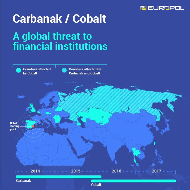 欧盟执法合作机构(欧洲刑警组织Europol)本周一宣布,Carbanak木马和Cobalt木马恶意袭击背后的网络犯罪团伙主谋已在西班牙被捕。这一行动得到美国联邦调查局、罗马尼亚、摩尔多瓦、白俄罗斯、台湾当局以及私营网络安全公司的支持。