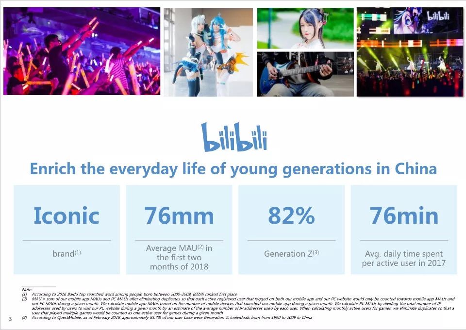 根据B站的路演PPT,B站2018年前两个月MAU7600万,其中82%的用户是“Z世代”(1990年至2009年间出生),2017年每活跃用户在线时间76分钟。