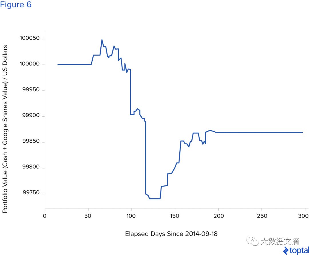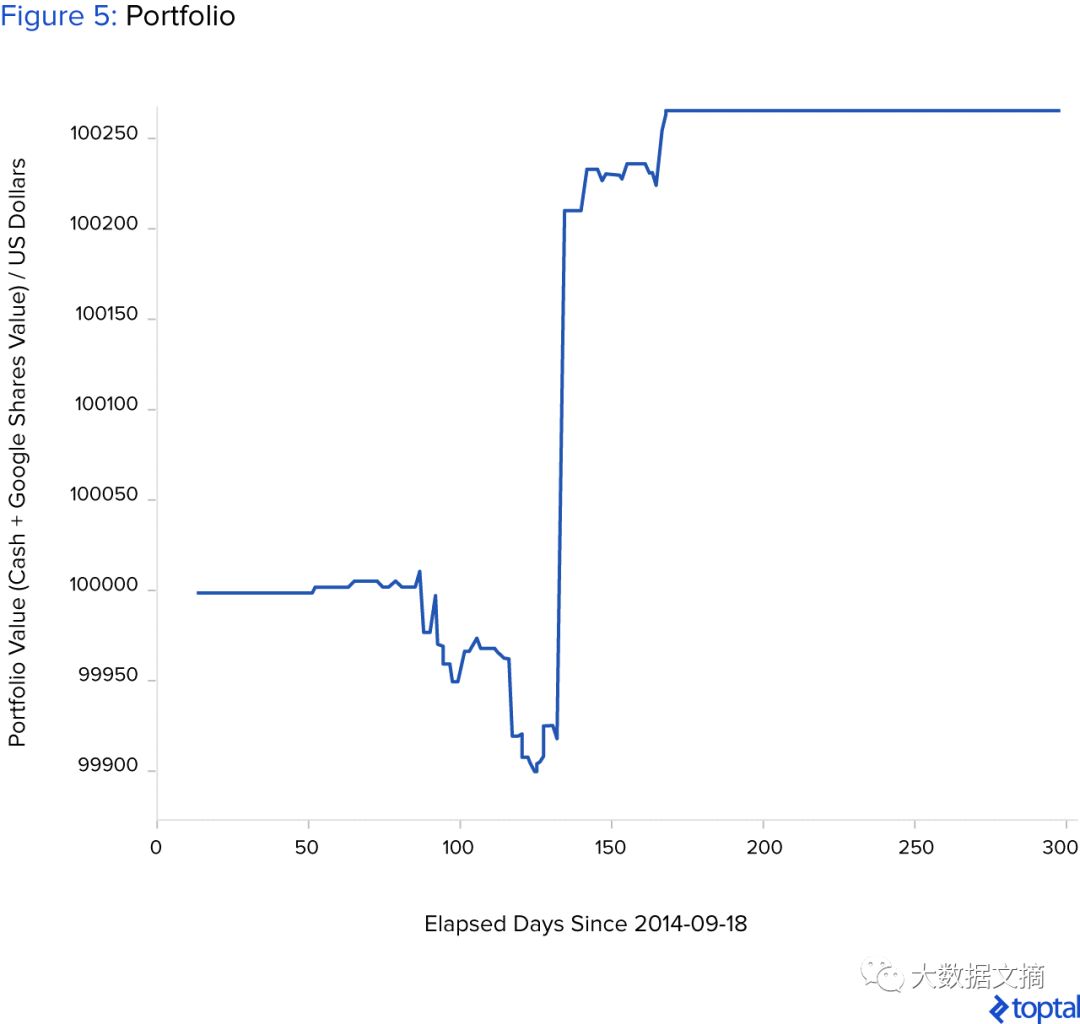 投资组合的初始价值(现金和股票的总价值)设定为100,000美元。每次交易行为将买入n股该公司(以Google为例)的股票或卖出所持有的该公司的所有股票。在初始时刻,系统对该给定公司股票的持有量为0。