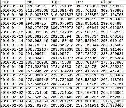 数据集中只有日期,开盘价,最高价,最低价和平仓价等五列数据,分别表示交易开放时证券首先交易的价格,即证券在给定交易日上达到的最高价格,给定交易日的最低价格以及当天交易证券的最终价格。