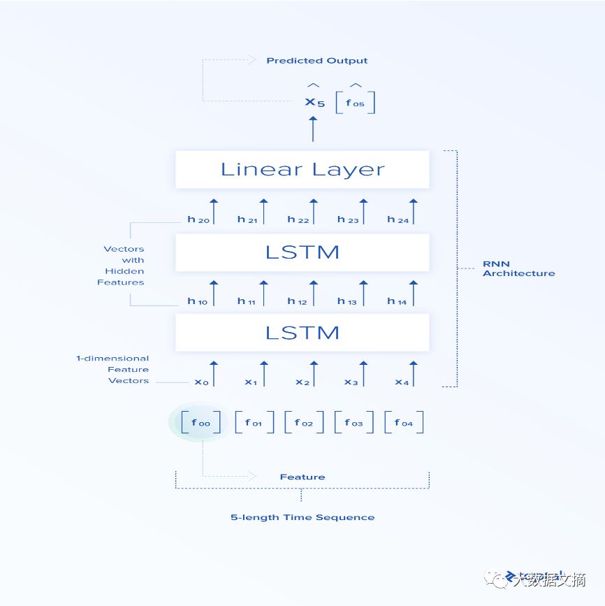 我们把神经网络的输入称为“特征向量”。这是一个n维向量,其元素是特征:f_{0},f_{1},f_{2}…,f_{n}。现在,我们来解释循环神经网络是如何应用到与金融相关的任务上的。循环神经网络的输入是[X_{t_0},X_{t_1},X_{t_2},…,X_{t_n}]。这里让n=5。