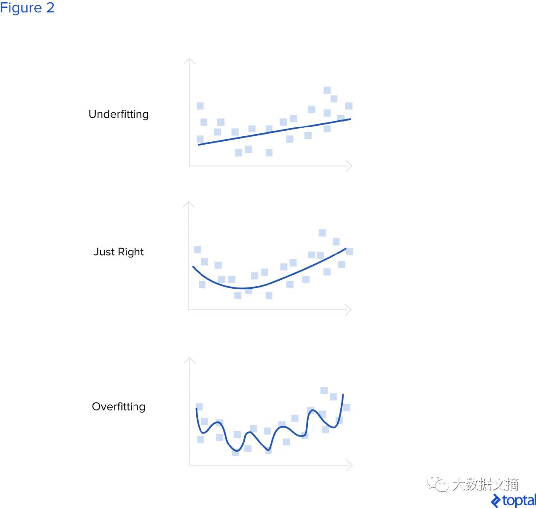 蓝色的线表示神经网络模型。第一张图表示当神经网络参数较少时,不能拟合训练数据和泛化的情况。第二张图表示在有最优参数数量时,神经网络对新的数据有较好的泛化能力。第三张图表示当神经网络参数太多时,这个模型过拟合训练数据,但是在验证集和测试集中表现不佳。
