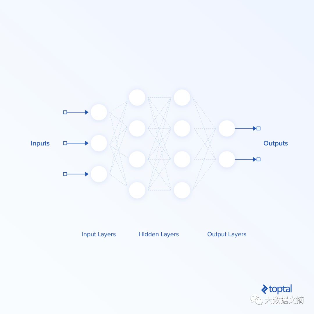 神经元之间的连接是加权的。这些权重需要调整以便神经网络对于给定输入返回准确的输出。前馈网络将数据从输入空间映射到输出空间。隐藏层从前一层的特征中提取重要的和更抽象的特征。