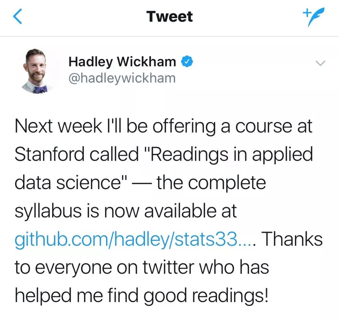 不同于以往的授课式课堂风格,这次斯坦福大学的教授Hadley Wickham开设了一门论文讨论课。课程名为:Readings in Applied Data Science。要求学生每周阅读3~4篇论文,并给出反馈。