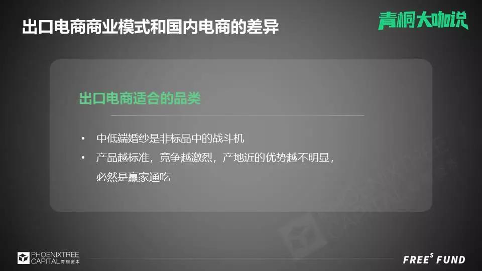 第三个,是品类。出口电商究竟适合什么样的品类?在过去十年当中,出口电商中有一个非常细分的品类是卖得特别好,就是婚纱,可以称为“黄金品类”。我们开玩笑说“婚纱是非标品中的战斗机”。它有以下特点:重量轻;严重非标,时尚感比较强,每一个女生都想要一件独一无二的婚纱;起订量低但客单价高,一件婚纱价格,动辄几千上万人民币。
