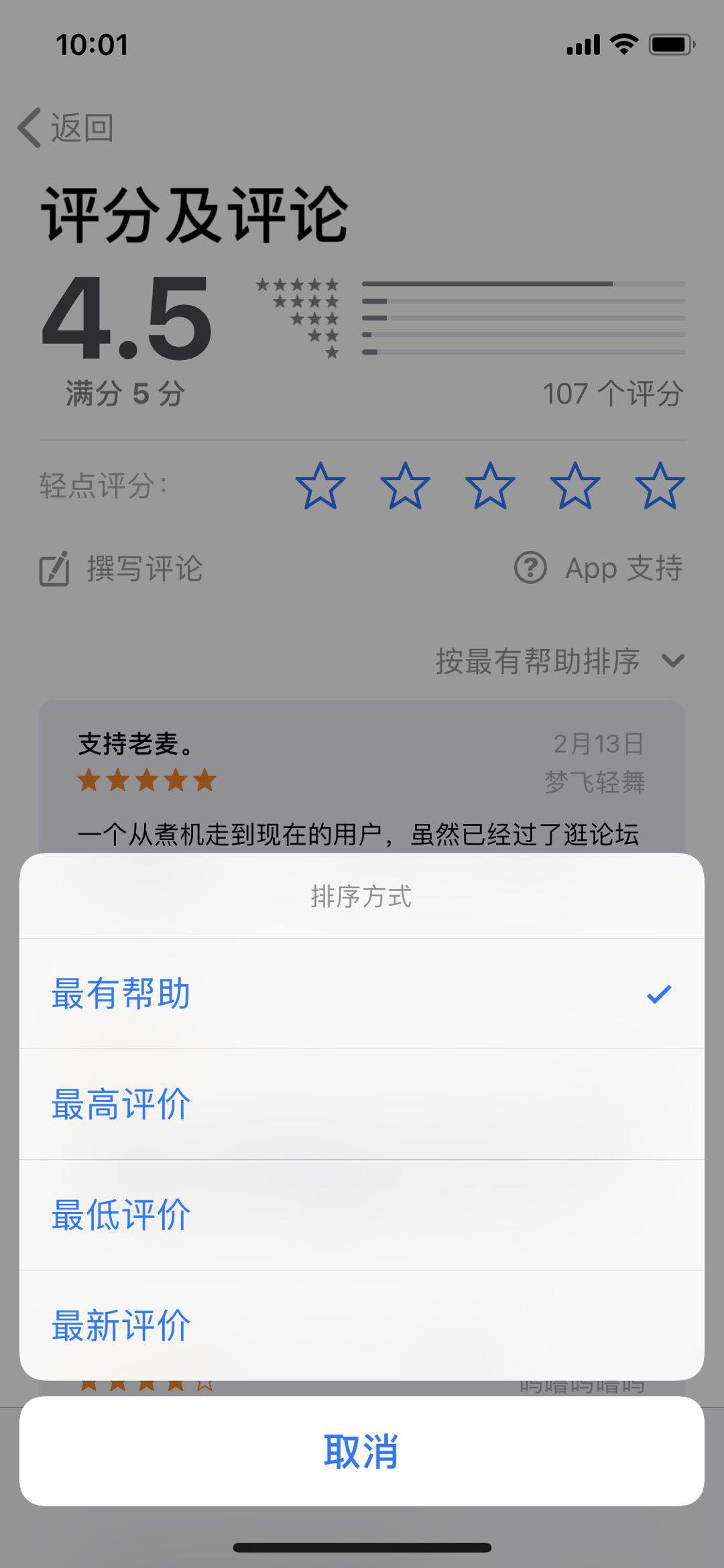 App Store 评分有时也会影响到我们对于一款应用的第一印象,现在你可以选择按「最有帮助」「最高评价」「最低评价」或「最新评价」来选出自己最关心的内容。
