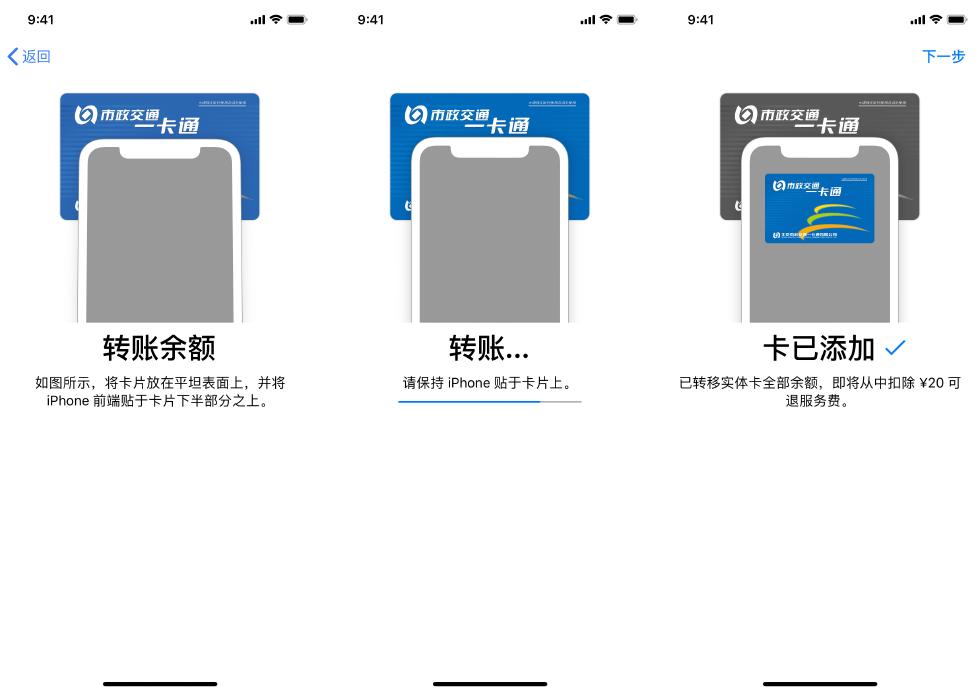 如果此前已有实体交通卡,可以选择「从现有卡片转出金额」,按照提示输入卡号,将交通卡贴在 iPhone 背部等待余额转移,完成后就会自动将交通卡添加到「钱包」App 中。