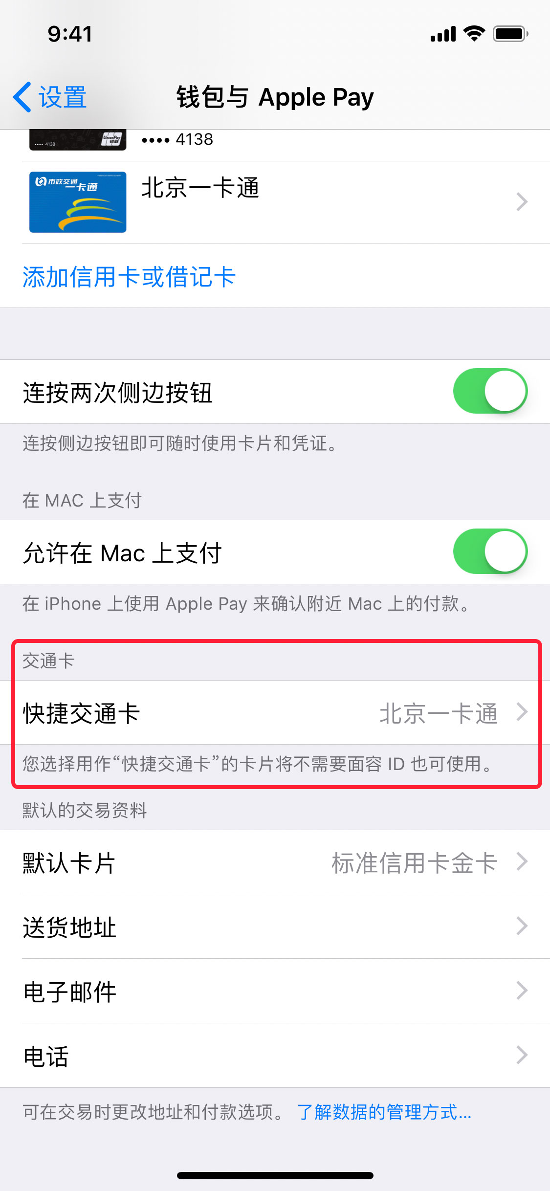 以往使用 Apple Pay 刷卡时都需要先通过 TouchID 或 FaceID 认证,不过刷交通卡则不需要这些验证,在系统设置中设置「快捷交通卡」,之后刷地铁卡的时候只用把手机贴过去就行,不需要再重复 Apple Pay 付款的步骤。