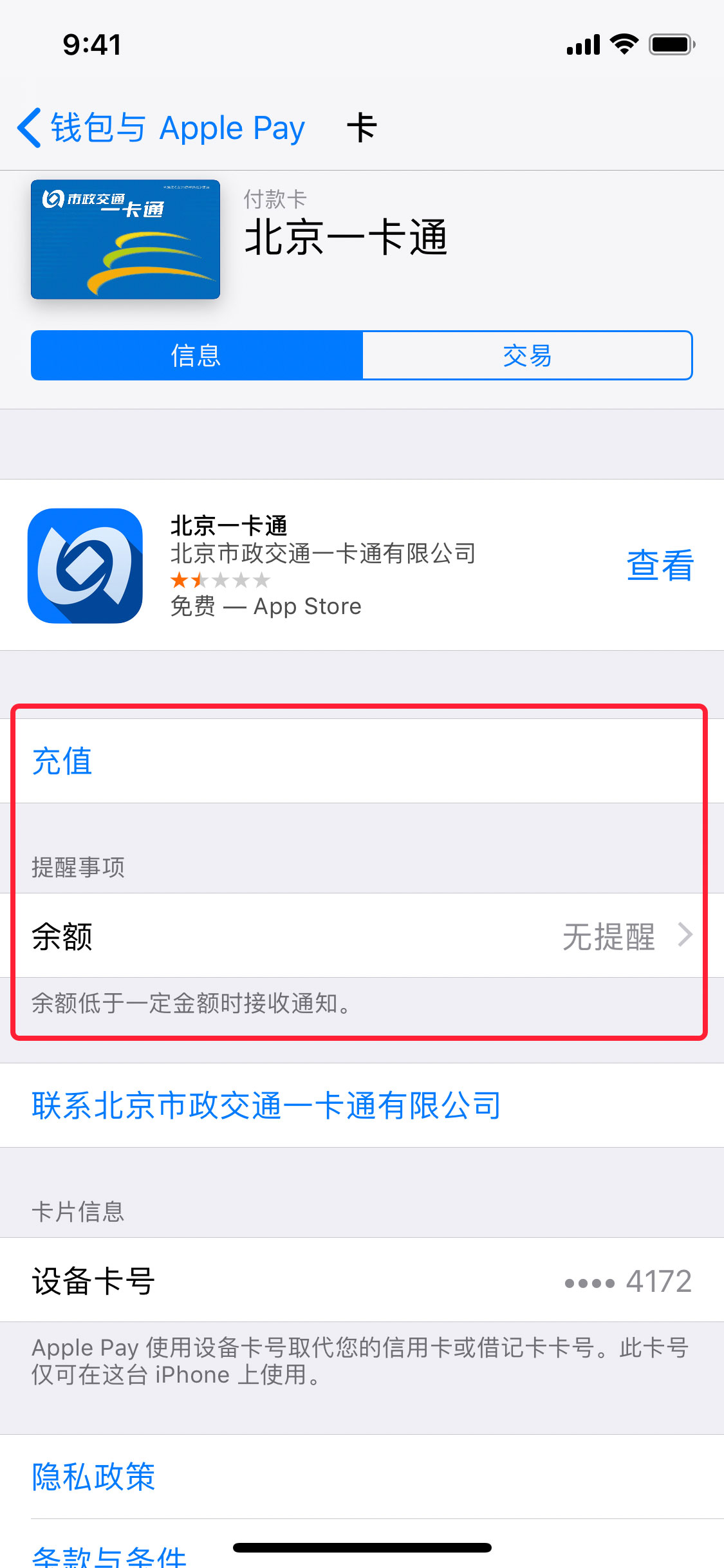 在交通卡管理页面(系统设置 - 钱包与 Apple Pay - 选择对应交通卡)可以直接充值,还可以设置余额提醒,当余额少于指定数额时自动提醒充值。