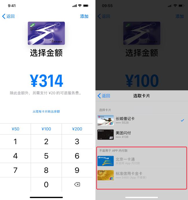 系统默认开卡方式是办理新卡,选择预设金额或者输入任意金额,点击「添加」后系统会通过 Apple Pay 的方式付款,除了卡内金额外还需额外支付¥20 的服务费,需要注意的是交费卡只能是借记卡,信用卡不能用作充值。
