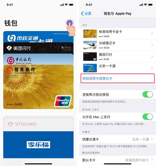 交通卡开通的方式和添加银行卡的方式类似,可以在「钱包」App 的卡片聚合视图下点选右上角的「+」,或在「系统设置 - 钱包与 Apple Pay」中点击「添加信用卡和借记卡」开通。