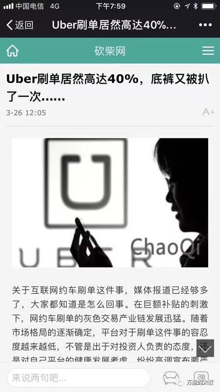 王慧文给出的证据是两篇文章,几乎一模一样的标题,只是把“Uber”改成了“美团打车”,具体如下:《美团打车刷单居然高达40%,底裤又被扒了一次》和《Uber刷单居然高达40%,底裤又被扒了一次》。