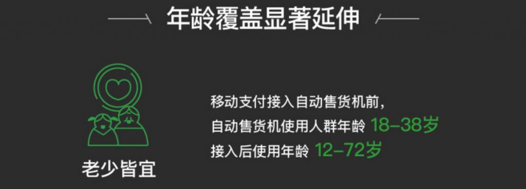 无人终端距离用户越来越近的同时,随着移动支付的接入,消费者的年龄覆盖也显著延伸,从 18-38 岁扩展到 12-72 岁。与此同时,根据中百协会提供的数据,消费者满意度也从移动支付接入前的不足 55% 升至大于 85%。