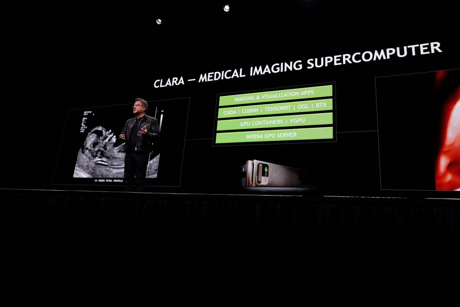 老黄推出了第一款专用于医疗图像处理的超级电脑 Clara,它能够支持 CUDA、CUDNN、TensorRT、OGL 以及刚刚提到的 RTX 技术。