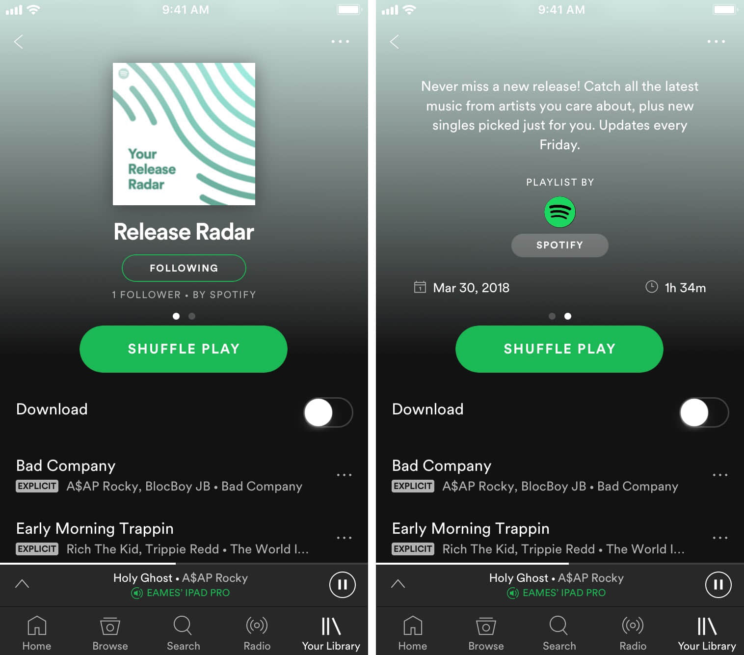 Release Radar 是一个和 Discover Weekly 类似的歌单,你在 Spotify 里关注的或者常听的歌手最近发新歌了,就会出现在这里。也就是说 Release Radar 其实更关注近期发布的新音乐,而不是你没听过的音乐。此外它也会根据你的偏好给你推荐一些你可能会感兴趣的新歌。