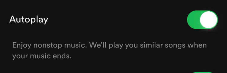 在 Spotify 设置里,有一个叫「Autoplay」的选项,打开后,不论你刚播完专辑还是歌单,它都会自动往后播放同类型的歌曲,让 Spotify 保持一直播放的状态,让你的耳边一直有音乐。