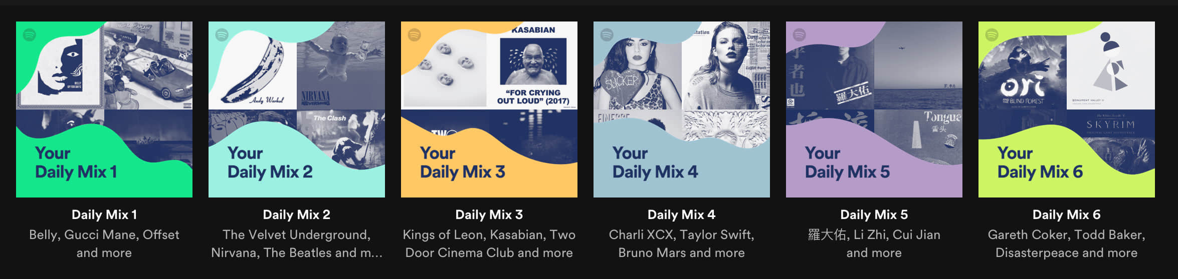 Daily Mix 可以理解为每日推荐歌单,每天更新一次。它不像有些音乐服务把所有曲风的歌曲都揉杂到一起,而是会根据你的听歌喜好,自动生成 6 份不同曲风的歌单,这样的好处是更能适应不同的听歌场景和心情。