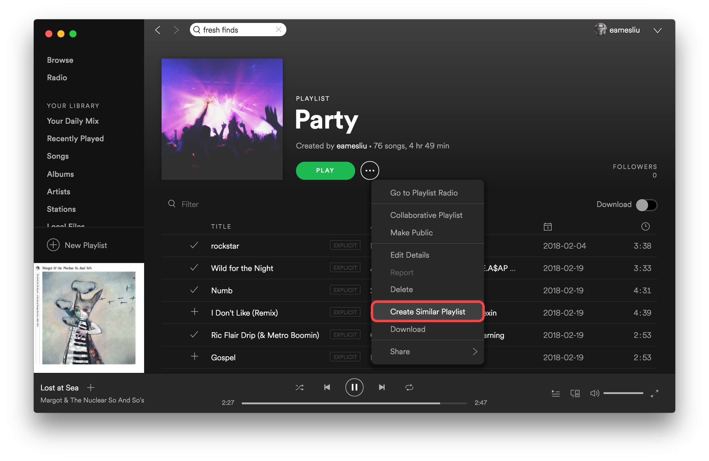 你还可以用一种最简单粗暴的方法,直接创建电台,不论是单曲、专辑、歌手、歌单,都可以对它们创建电台,Spotify 就会根据创建的来源,自动生成一堆相似风格的歌曲。