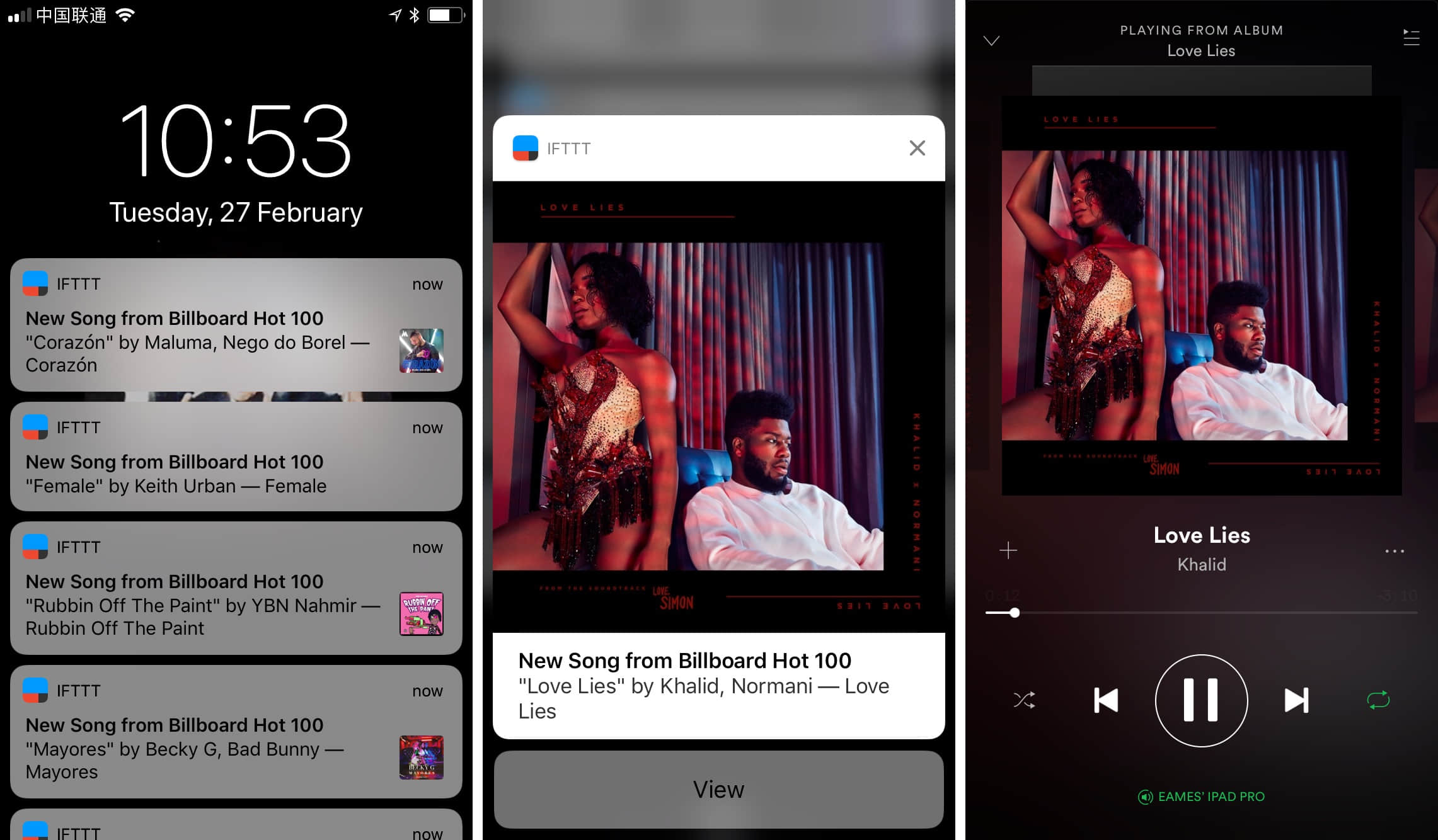 如果关注哪些周期更新的歌单,比如 Billboard,可以借助 IFTTT 服务,当 Billboard 有更新时,推送一条通知到你的手机里,点击即可以跳转到 Spotify 直接收听。