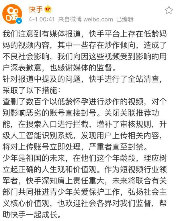日前,央视《新闻直播间》节目报道了短视频平台出现大量未成年怀孕视频,以未成年生子为噱头,争相炫耀。今天凌晨,在节目中被点名的快手在在官方微博上做出回应,称进行了全站清查,查删封禁了一批视频和账号,同时关闭推荐功能,升级人工智能识别系统,加强核查。