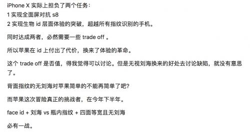 据悉,魅族高级副总裁李楠在知乎平台"为什么大家讨厌刘海屏?"话题中讨论很激烈,分享了对于"刘海屏"设计的观点:"首先他承认刘海屏不美观,但随即举例"汽车车头美观吗?可因为要容纳发动机、变速箱等,使得这一原型无法突破。iPhone X 实际上担负了两个任务:1、实现全面屏对抗三星s8;2、实现生物 id 层面体验的突破,超越所有指纹识别的手机。"