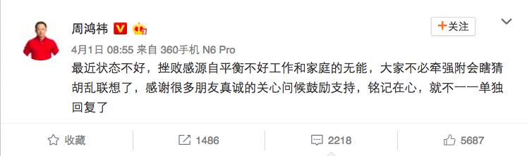 36氪讯,4月1日上午,360集团董事长兼CEO周鸿祎发微博回应为何“人生失败”,称挫败感源自平衡不好工作和家庭的无能,同时也希望“大家不必牵强附会瞎猜胡乱联想”。