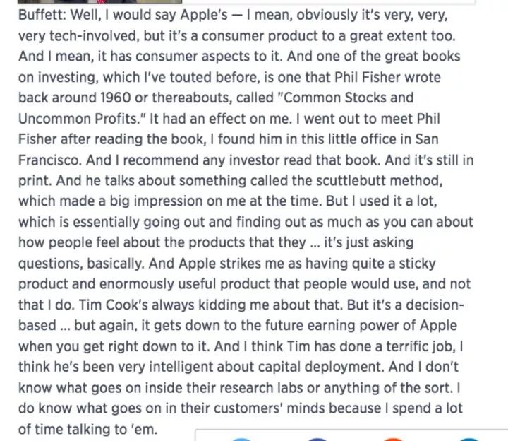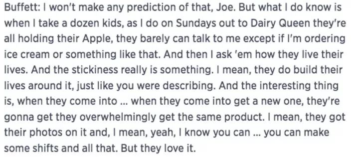 上面的文章是巴菲特的原话,在我看来,巴菲特看中的苹果的消费品的属性,而从巴菲特的调研来看,他采取了“费雪”的闲谈投资,去与消费者,尤其是与小孩闲谈,他看到的是消费者对苹果产品的喜爱,以及不易变更的属性。对其方面,巴菲特并没有过多的评论,而其实再想想,巴菲特所说的,似乎并不是深奥的东西。