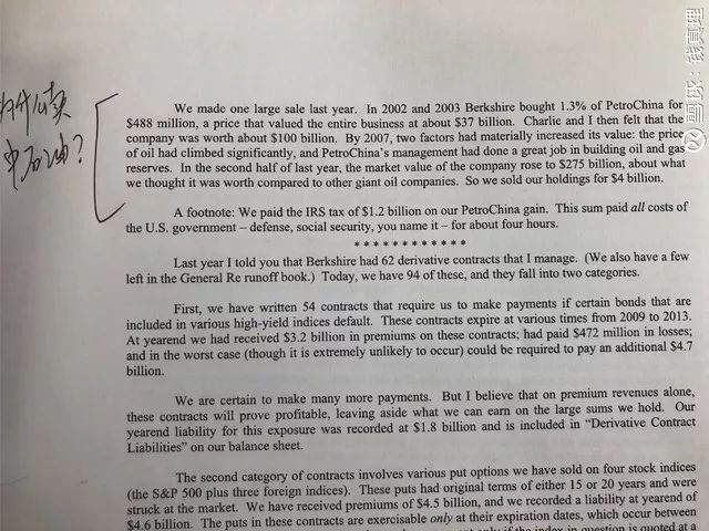 我们在2007年做了一笔大额的卖出。在2002,2003年的时候,我们花了4.88亿美金买了1.3%的中石油,当时整个中石油估值大概是370亿美金。当时查理和我认为中石油应该大概值1000亿美金。