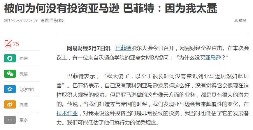 最近,巴菲特对亚马逊的Jeff Bezos当了世界首富,赞叹不已,并且对自己没买亚马逊的股票,感到很蠢。