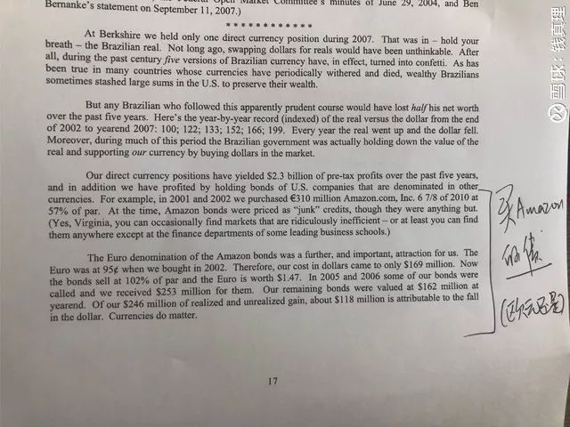 在2001-2002年,巴菲特抄底了亚马逊的债券,以57买入,当时亚马逊被评为垃圾评级,而巴菲特认识,亚马逊显然不是垃圾。更有意思的,巴菲特买的是欧元债,而当时欧元对美元的汇率是0.95。当巴菲特卖出的时候,不仅债券涨到了102,同时欧元变成了1.47。
