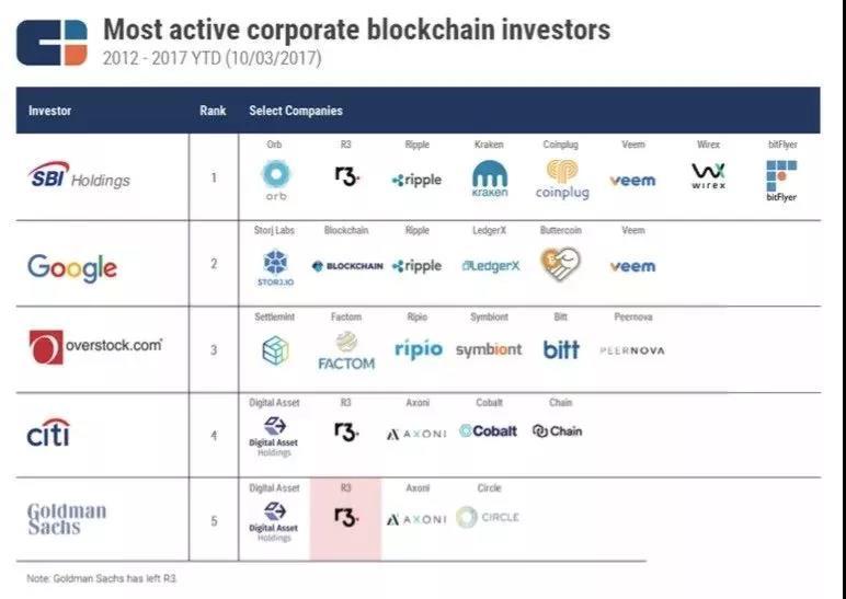 SBI Holdings是区块链领域最活跃的投资者,已经投资了8家区块链公司。Google和 Overstock.com分别投资了6家区块链公司。花旗银行投资了5家公司,高盛投资了4家公司。