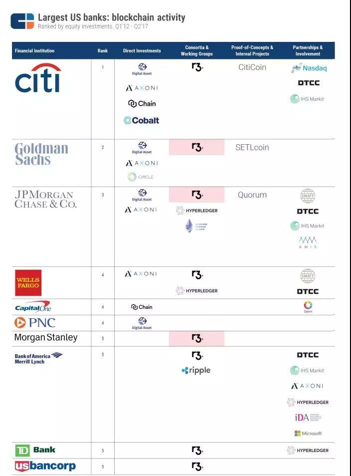 我们可以发现,美国的银行巨头们在区块链领域有着较为深入的布局。