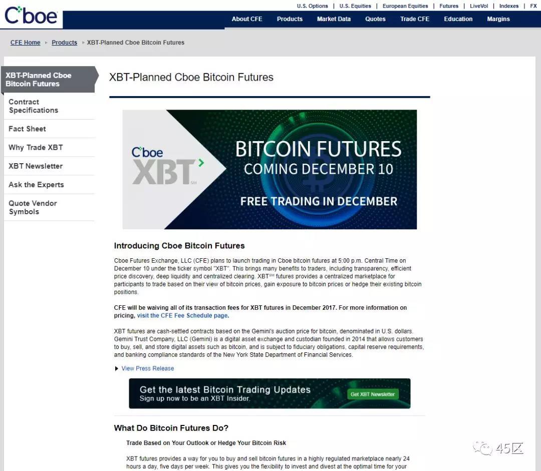 45区(ID:block-45)注意到,这个代码在去年年末又重新出现。美国商品期货交易委员会(CFTC)于12月1日结束审查,允许比特币期货在芝加哥商业交易所(CME)和芝加哥期权交易所(Cboe)交易,12月5日Cboe官网发出公告,该交易所的比特币期货(代码“XBT”)于12月10日正式挂牌交易。