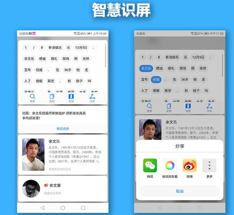 在搭载了EMUI的华为、荣耀系列产品中,我们还可以见到一项名为智慧识屏的功能。只要双指长按屏幕就可以实现对图片和文字的共同读取,并且通过AI理解图片与文字的语义,呈现出地址、电影购票、饭店大众点评等等服务卡牌。点击这些卡片,就可以直接跳转第三方App,极大的减少了App间的手动调度。