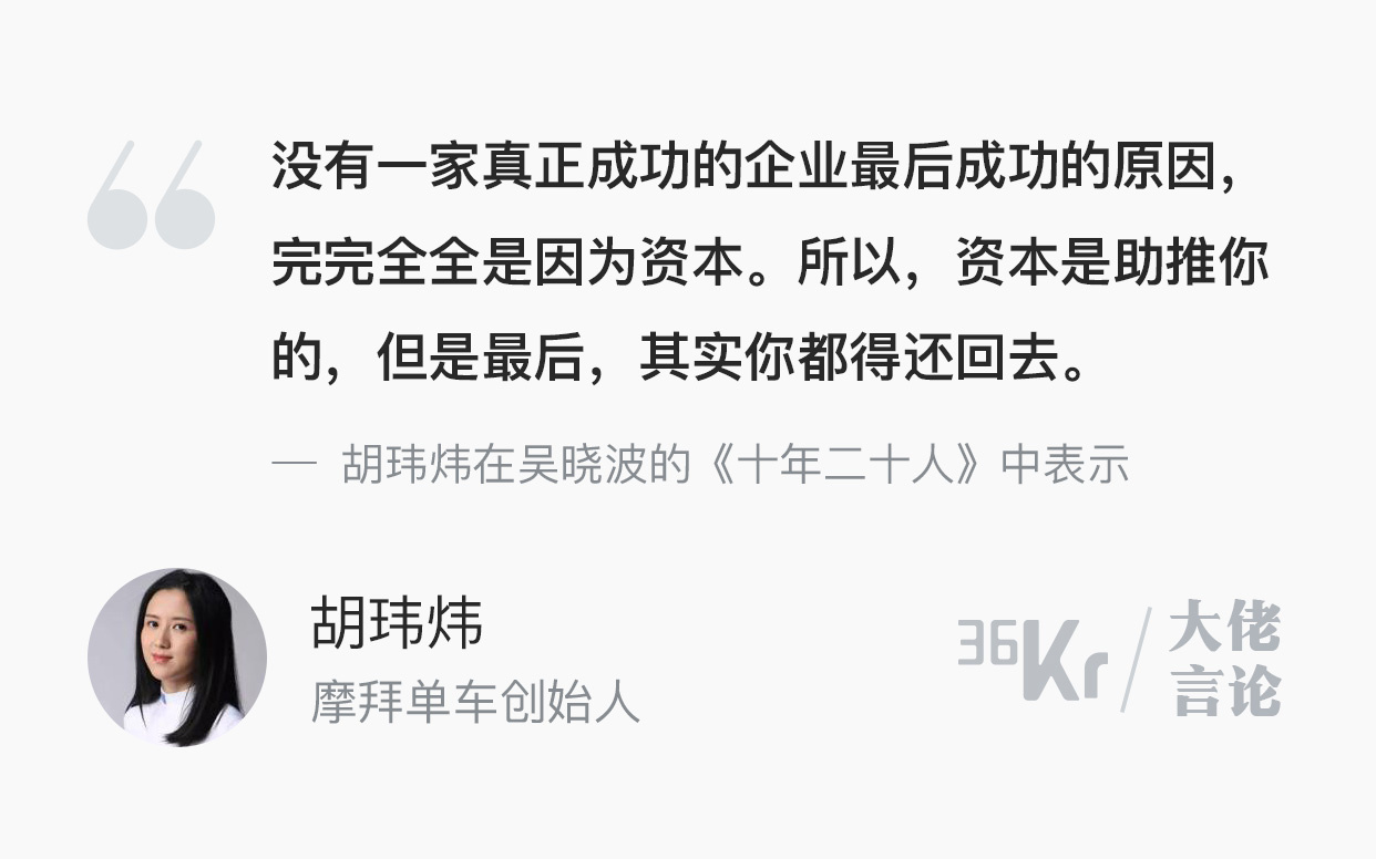 2018年春节前,胡玮炜接受了吴晓波《十年二十人》的采访。在提及资本和摩拜的关系时,胡玮炜表示,“没有一家真正成功的企业最后成功的原因,完完全全只是因为资本。所以,资本是助推你的,但是最后,其实你都得还回去。”