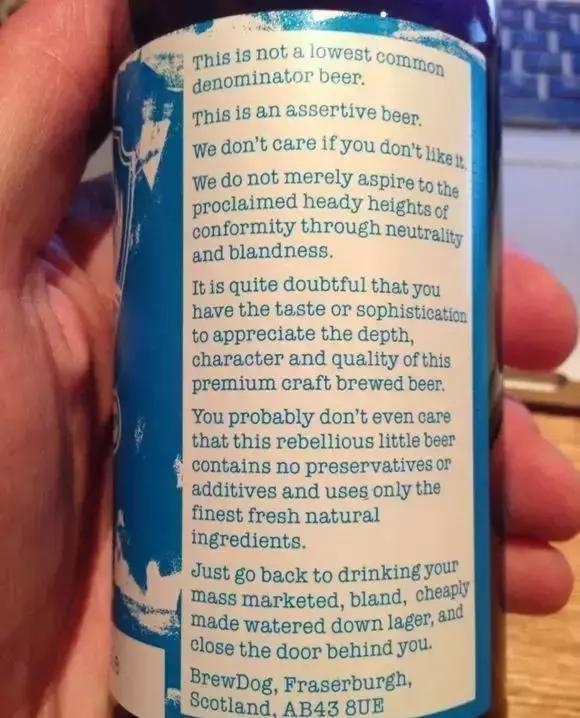 “这不是一款通过普通标准化流程制造出的啤酒。我们并不仅仅追求从那些味道平庸千篇一律的啤酒中脱颖而出。其实我们非常的怀疑,你是不是有足够的品味欣赏这款啤酒的深刻内涵、鲜明个性和优异的品质。也许你并不在乎这瓶酒在酿造过程中只用最好的新鲜材料,它不含防腐剂、添加剂。那么你还是去超市选择廉价啤酒吧,再见不送。”