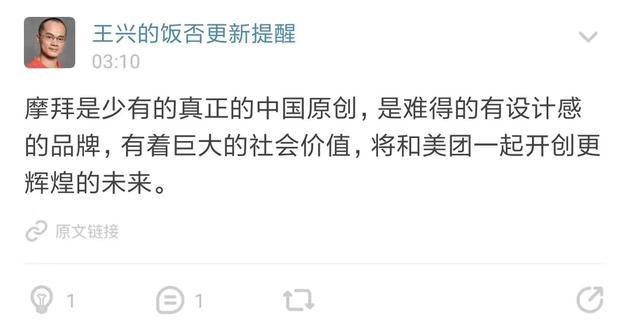王兴认为,摩拜是少有的真正的中国原创,是难得的有设计感的科技品牌,推动了绿色出行、低碳生活的普及,有着巨大的社会价值,因此非常感谢摩拜创始人胡玮炜、王晓峰、夏一平和他们的团队。