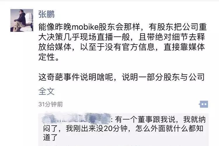 4 月 3 日晚上,摩拜召开股东大会,表决是否同意美团对其的收购;会议从晚上 9、10 点开始,大约在 11 点多的时候,会议中的信息就已陆续传到一些媒体手中——这些信息不仅有表决的结果,还包括一些非常详尽的细节。