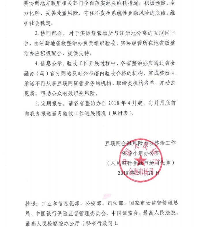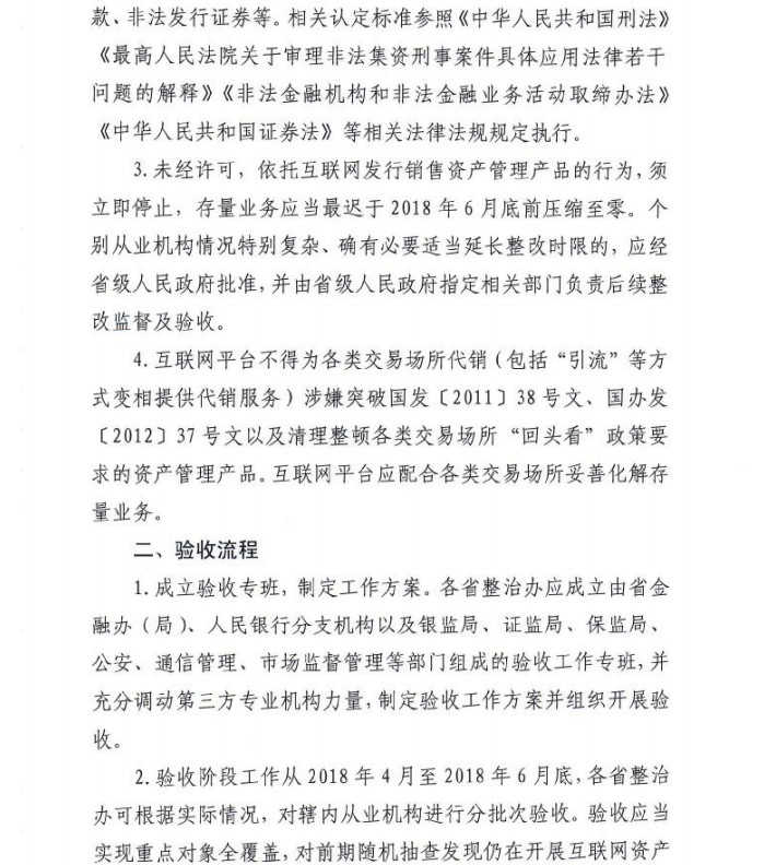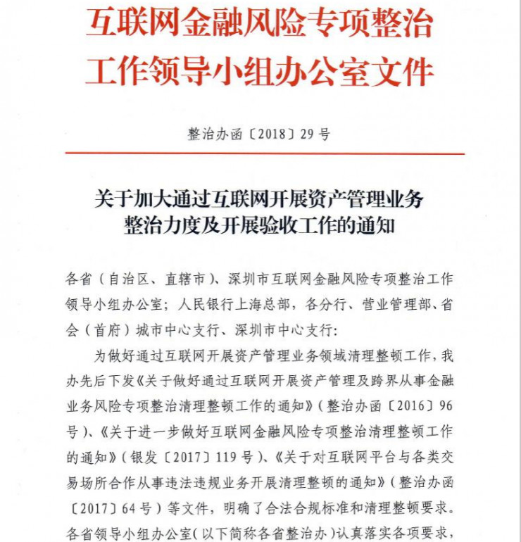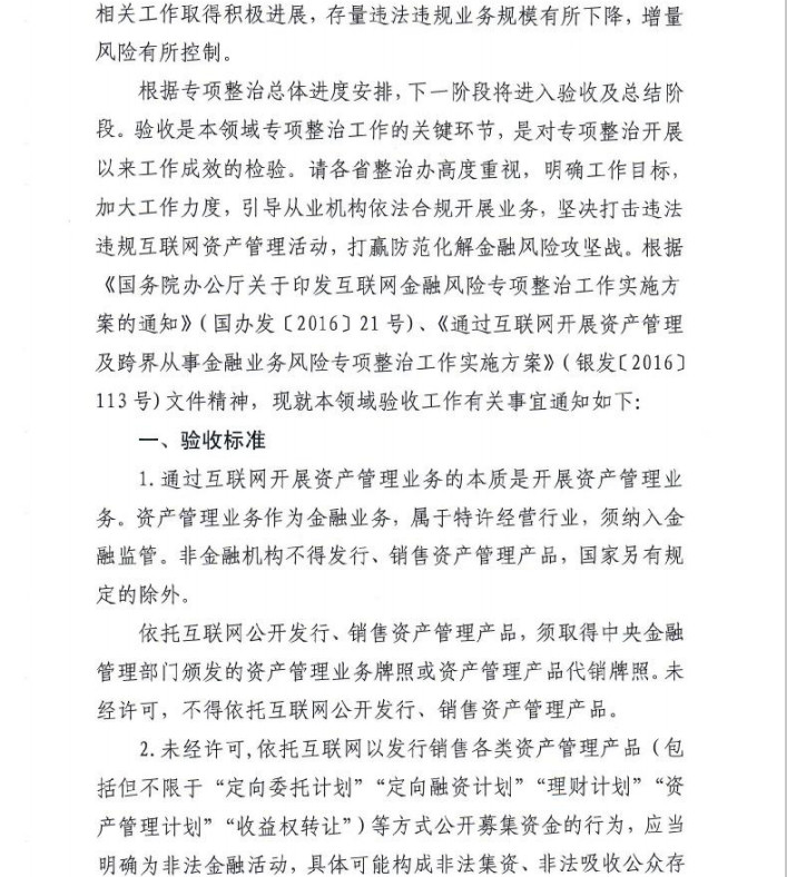 互联网金融风险专项整治工作领导小组办公室近日下发《关于加大通过互联网开展资产管理业务整治力度及开展验收工作的通知》(下简称“通知”),要求加大力度整顿通过互联网开展的资产管理业务。此次验收工作将在今年4月至6月底展开。